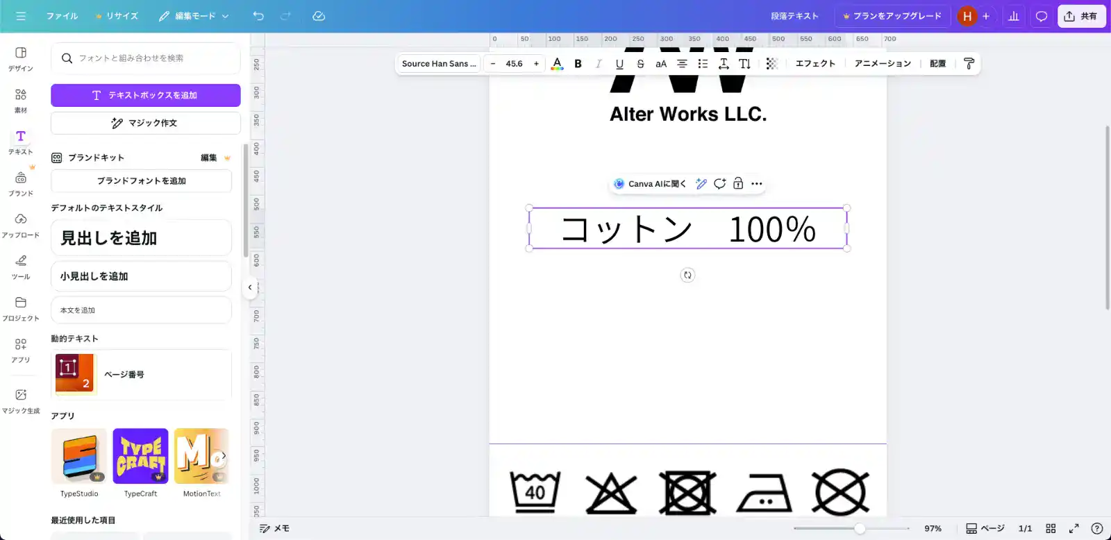 - 行間を調整して、中央揃えで「コットン 100%」の下に配置