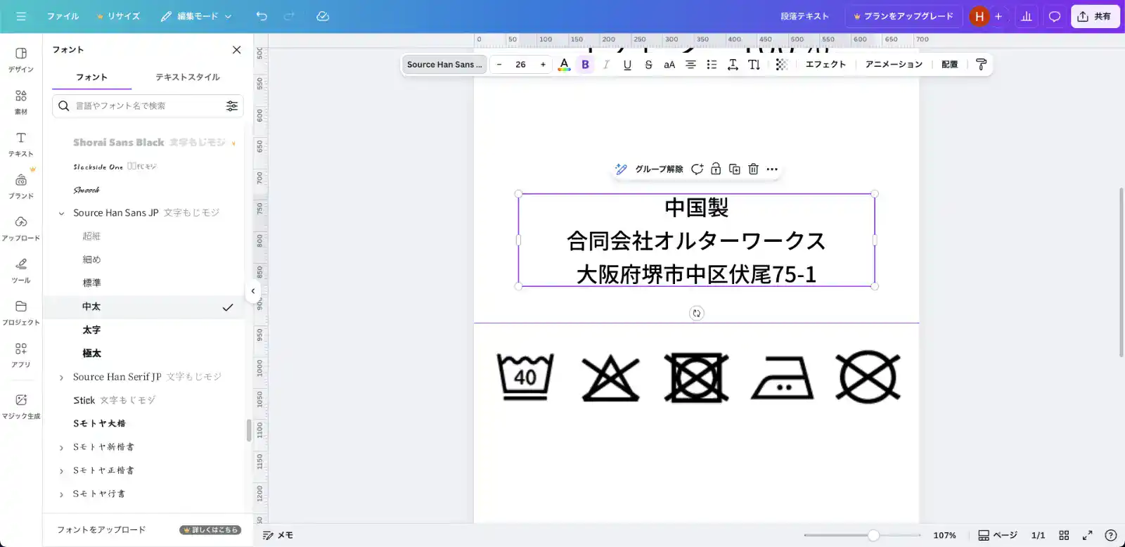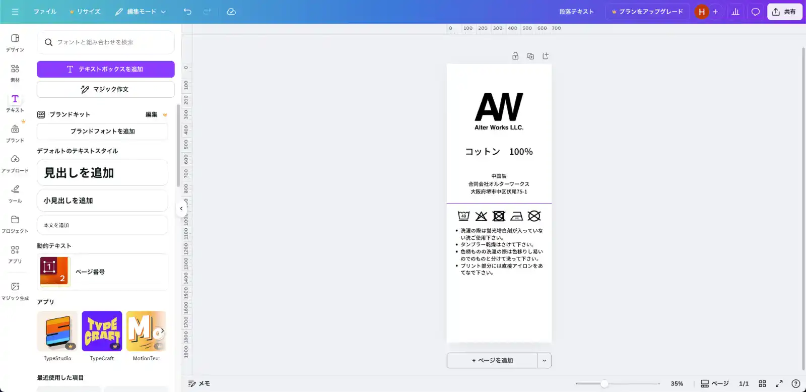 まずは画像系(ロゴ・洗濯アイコン)を先に配置して、全体の骨格を作ります。