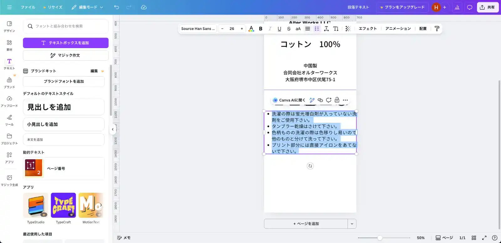 5-6. 下半分に注意書き(洗濯時のお願い)を入れる