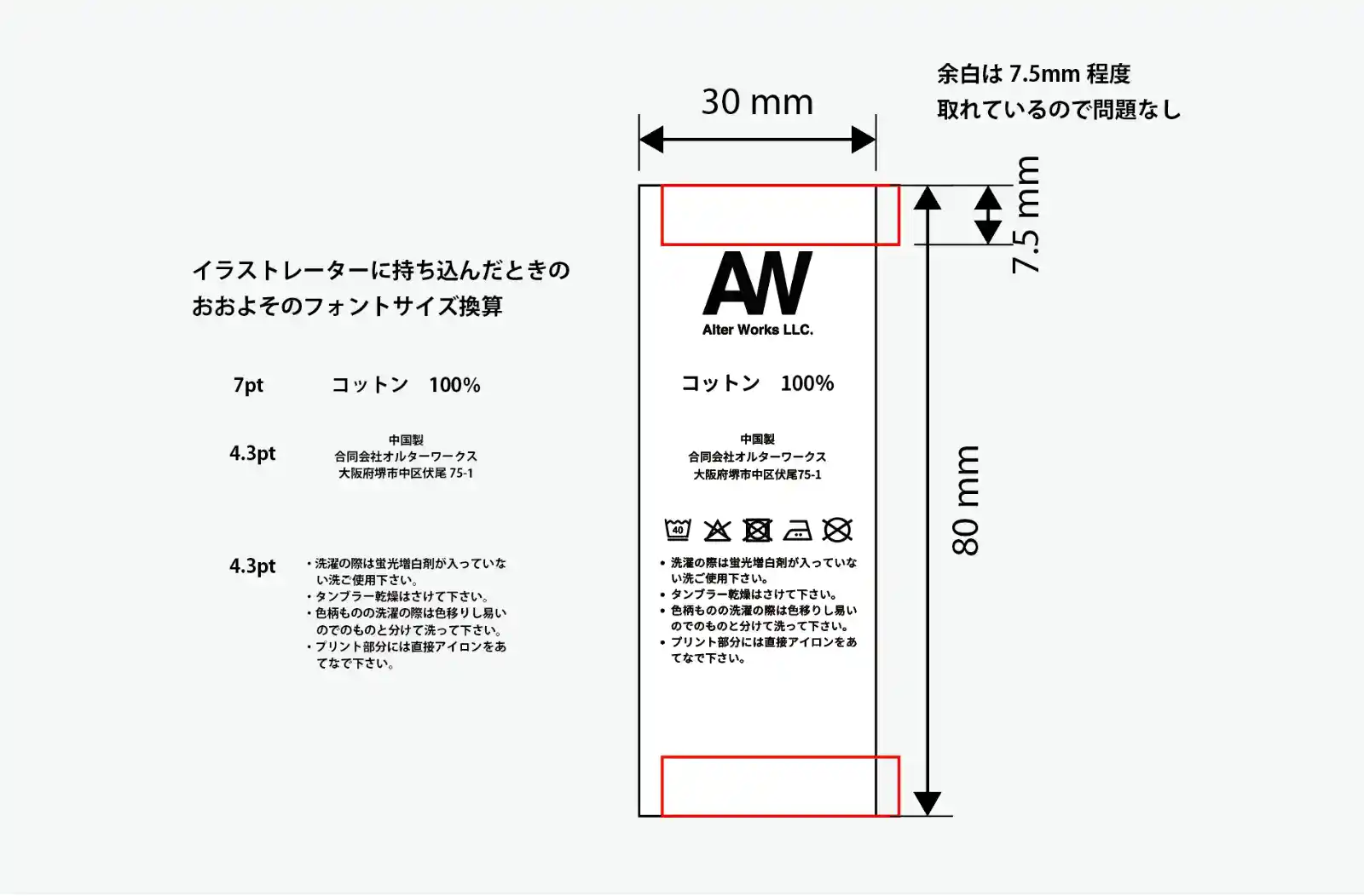 先に「ロゴ + 洗濯マーク」のバランスを取っておくと、