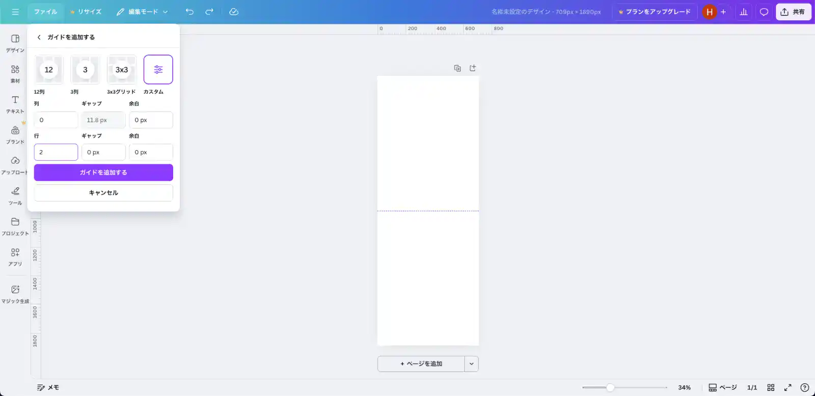 これでキャンバス中央に1本の横ガイドが入り、ここが折り位置になります。