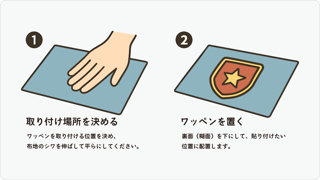 ※本ガイドは一般的なアイロン接着タイプの刺繍ワッペンに基づいた取り付け方法です。